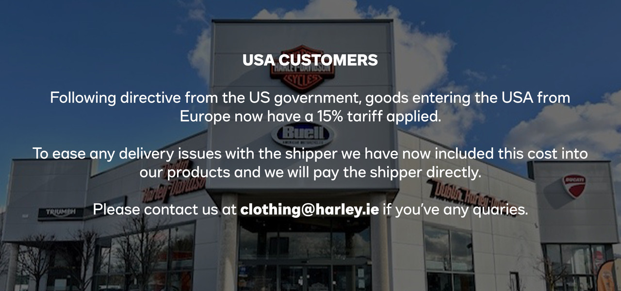 Following directive from the US government, goods entering the USA from Europe now have a 15% tariff applied. To ease any delivery issues with the shipper we have now included this cost into our products and we will pay the shipper directly. Please contact us at clothing@harley.ie if you’ve any quaries.